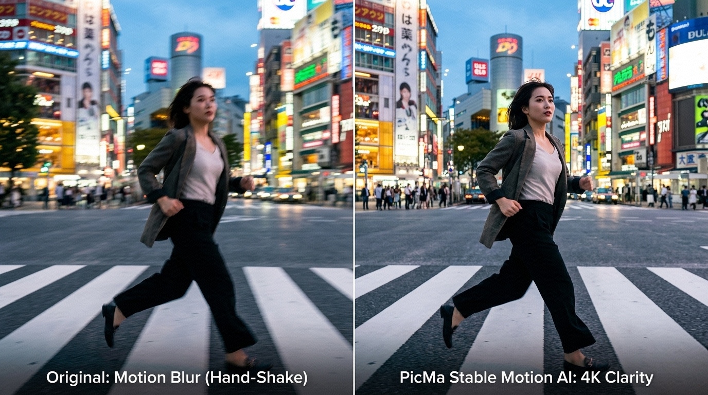 - The AI Solution: Unlike basic editors, PicMa Studio’s Stable Motion AI doesn't just "sharpen"—it reconstructs. By analyzing the directional vector of the blur (the path your hand moved), the AI predicts and re-draws the missing details, such as individual hair strands, skin pores, and sharp fabric textures.