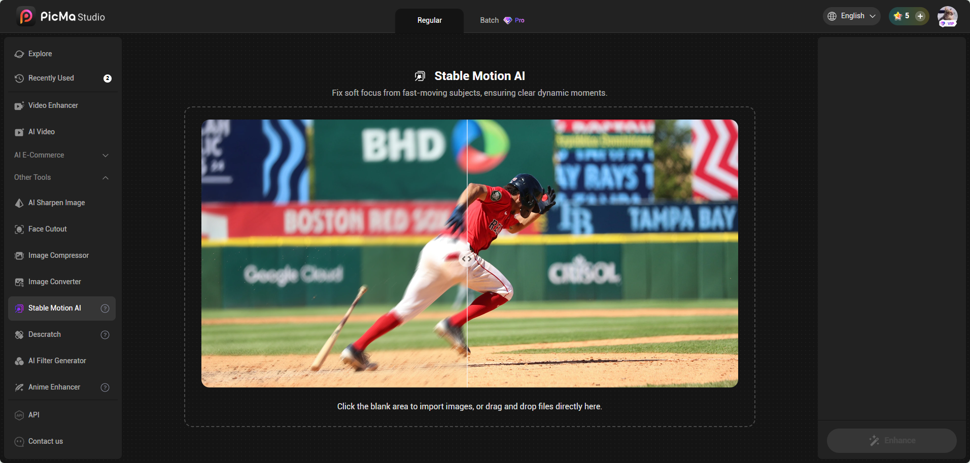 - Upload: Drag your blurry or shaky "failed" shot into the PicMa Studio dashboard.