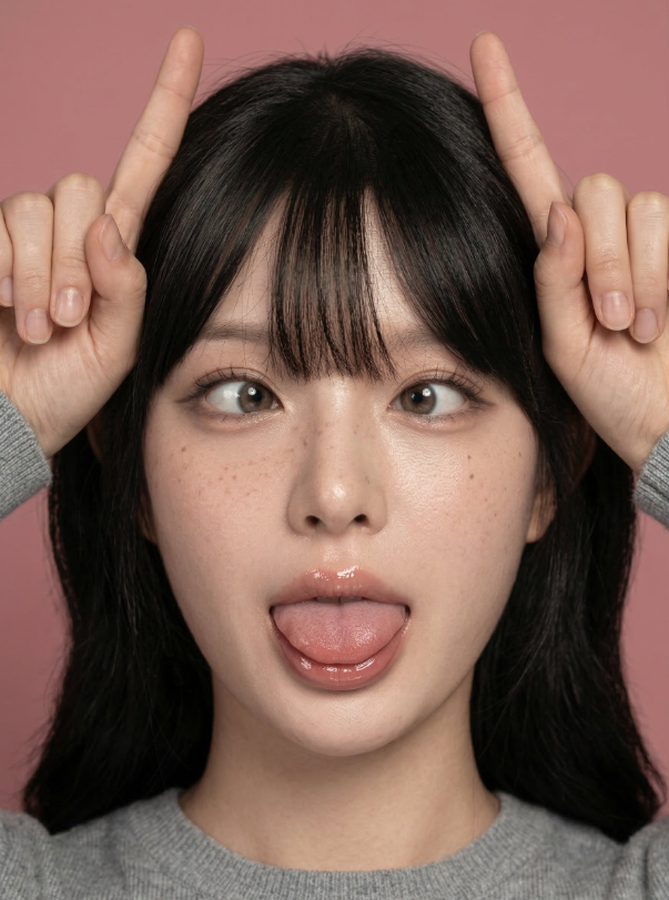 真髄は「ギャップ美」です。「cross-eyed, tongue out」「hands forming horns」でおどけた動作を明確化し、「Ultra-detailed」「8K」で細部を重視。「soft diffused studio lighting」で肌の透き通りを出し、ダスティローズピンク背景が肌色を引き立てます。