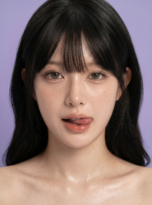 Stunning beauty portrait of a young woman with a playful expression sticking out her tongue, wet makeup and glossy lips, off-shoulder, softbox studio lighting, solid pastel background. Ultra-detailed, high quality photography, cinematic lighting, 8K.