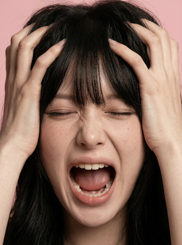 Extreme close-up studio portrait of a distressed young woman screaming, eyes shut, mouth wide open, hands gripping her hair, intense emotional expression, soft solid pastel pink background, ultra-detailed photography, dramatic soft lighting, fashion editorial shoot.