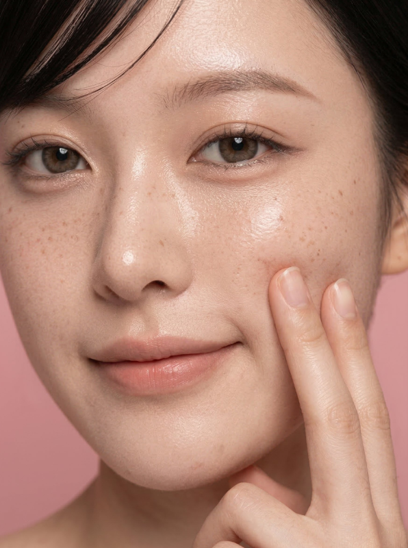 Ultra-detailed beauty close-up photograph of a young woman with a playful expression pressing her finger against her face, glowing skin texture, soft diffused studio lighting, minimalist rose pink background, commercial editorial style.
