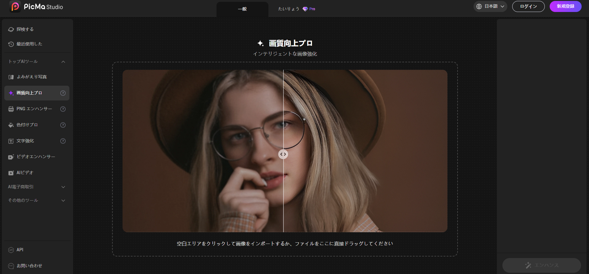 - ブラウザで「PicMa Studio 公式」を検索しアクセス(右上「言語」で日本語切り替え可)、アカウント無しで「画質向上プロ」ページに進みます。
