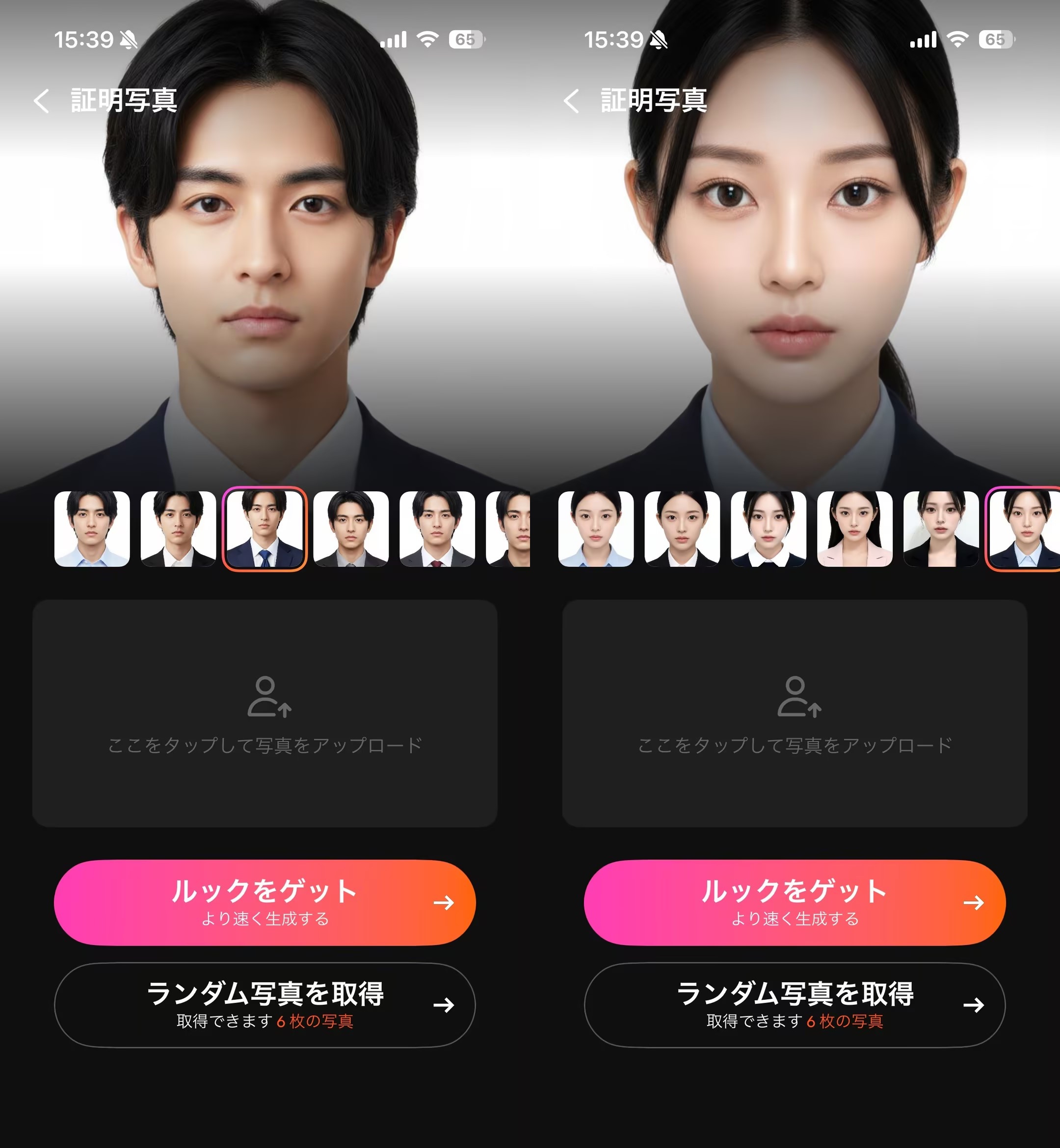4.「生成」をクリックすると、AIが迅速に処理し、複数のスタイルやサイズの証明写真を生成します。プレビューして、不満であれば再選択することも可能です。