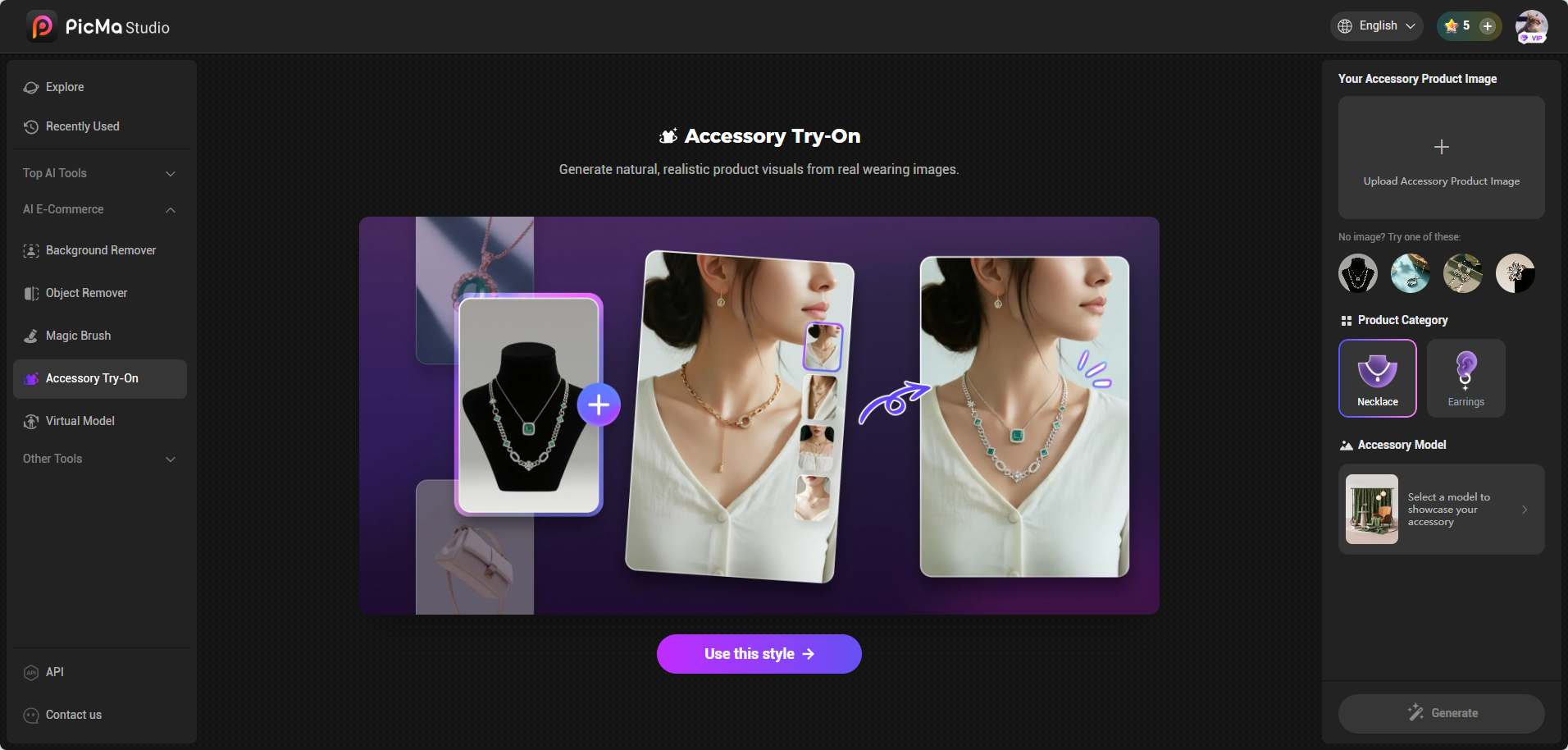 В стремительном мире электронной коммерции качественные визуальные материалы для товаров имеют решающее значение — но что делать, если у вас нет доступа к идеальной фотосессии или профессиональному фону? Для продавцов ювелирных изделий PicMa позволяет начать с простых фотографий товара, изменить фон и виртуально разместить ваши украшения на модели.