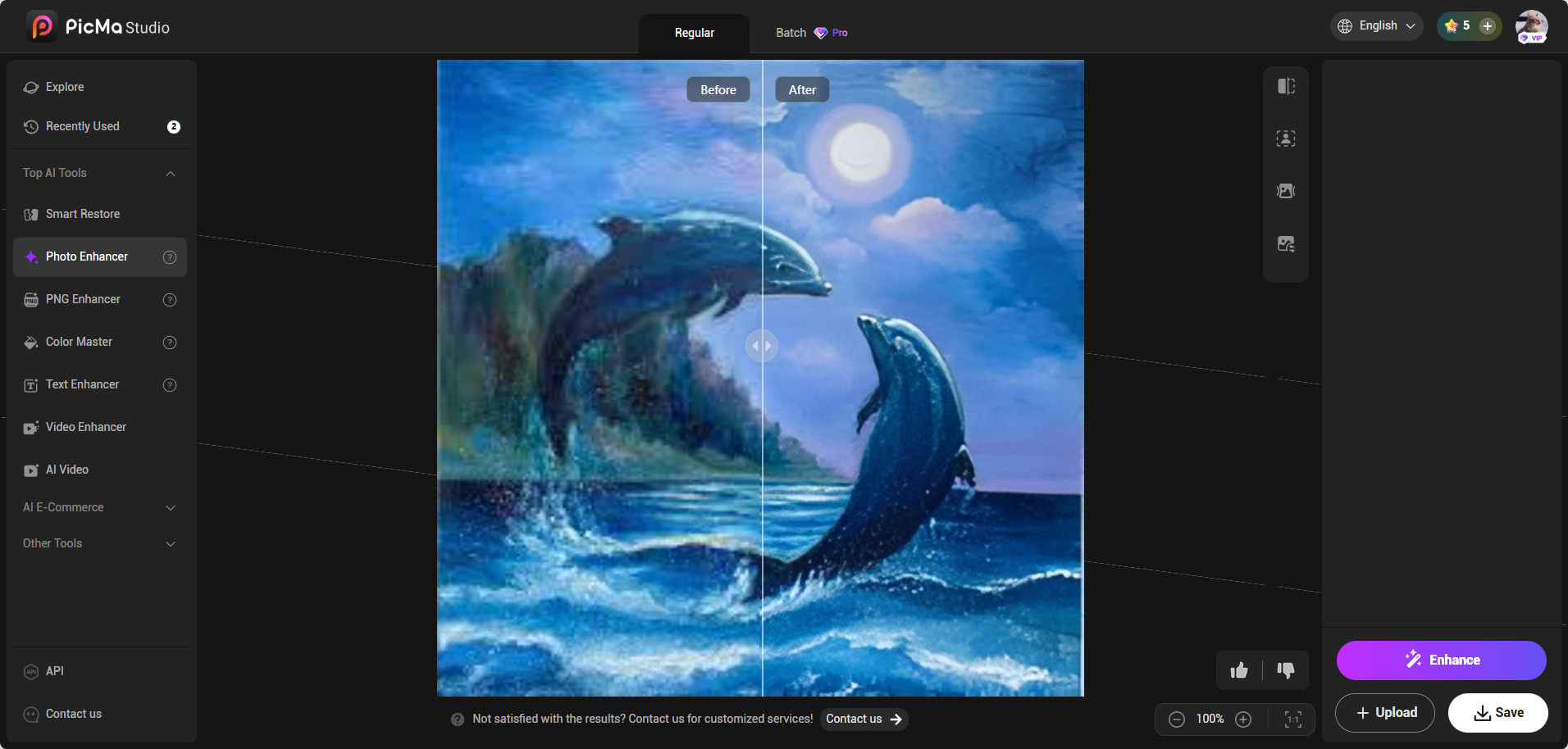 После загрузки подождите несколько секунд для получения результата. Вот где PicMa Studio выделяется. Вам не нужно выбирать сложные алгоритмы, вы просто нажимаете кнопку «Улучшить».