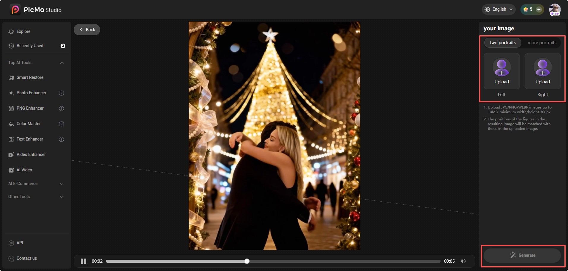 答:可以。像 PicMa Studio 這樣的進階平台,可以接收兩張個人肖像照,並智慧地將它們合成為一部他們自然互動與擁抱的單一影片。