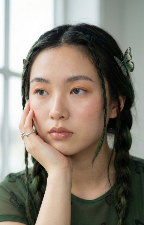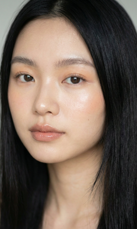 - 提示詞核心:臉頰:subtle pale peach blush (low presence)(淡淡的蜜桃色腮紅,存在感低)打亮:balm-like wet highlights on cheekbones(如護唇膏般的濕潤光澤打亮在顴骨)嘴唇:nude bean paste color(裸豆沙色)/ mirror-like tinted lip balm(鏡面般的潤色護唇膏)/ soft blurred edges(柔和暈染的邊緣)